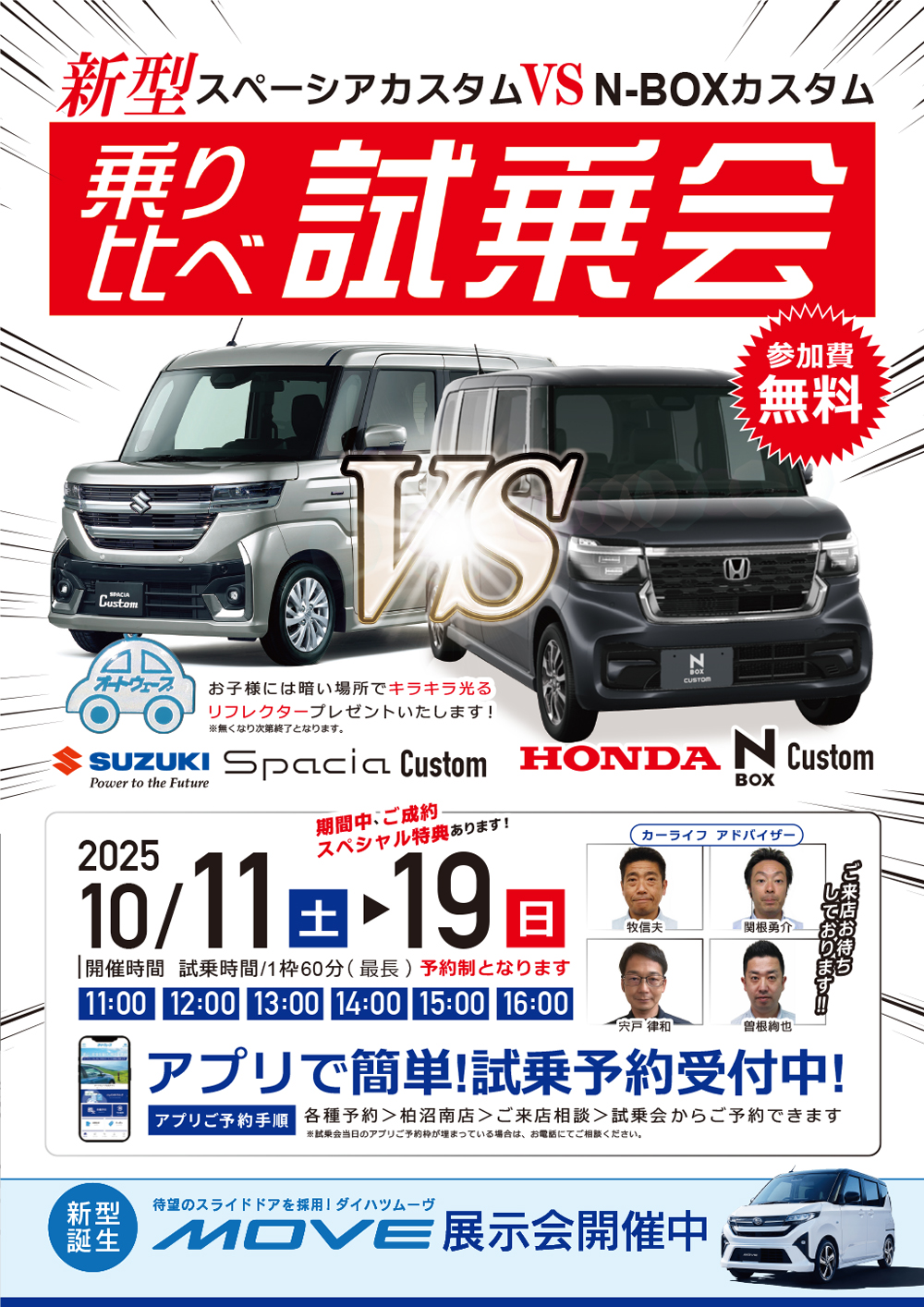 2025年10月11日(土)~2025年10月19日(日)の期間、オートウェーブ柏沼南店にて、話題の軽スーパーハイトワゴン2車種「新型スペーシアカスタム」と「N-BOXカスタム」の乗り比べ試乗会を開催します! 参加費はもちろん【無料】。ご家族でのご来場も大歓迎です!