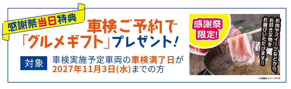 感謝祭当日、上総君津店限定で車検をご予約いただいた方に、選べるグルメをプレゼントいたします!