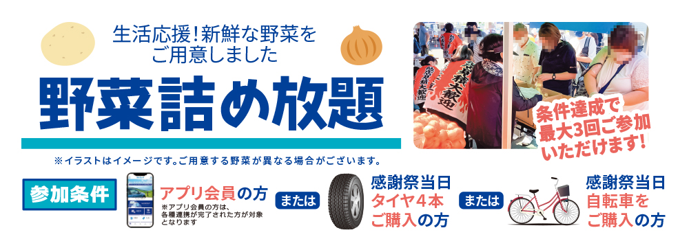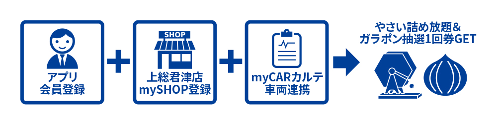 ②会員登録およびMY SHOPへの上総君津店登録までお済みの方……当日店頭にて、当社データベースへ登録されている車両を連携後、詰め放題参加チケットをお渡しいたします。