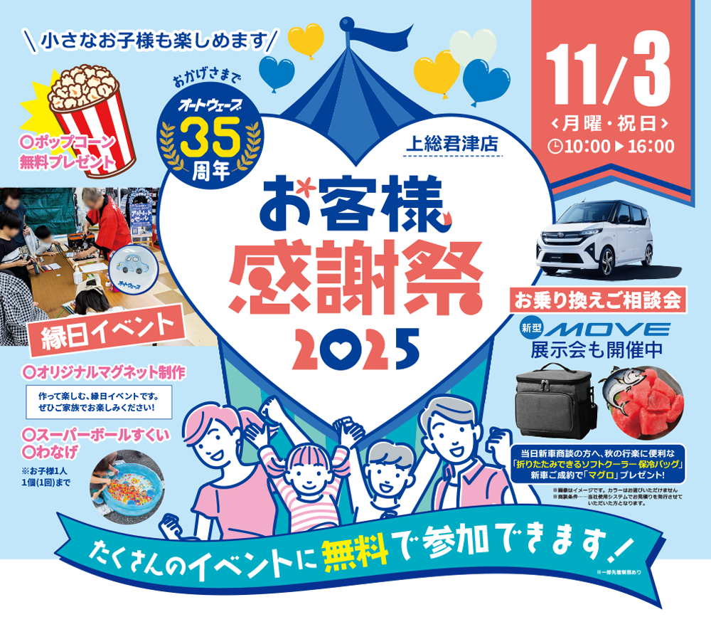 ※当日限定特典はオートウェーブ上総君津店で感謝祭当日のみ実施いたします。他店では受け付けておりませんので、予めご了承ください。