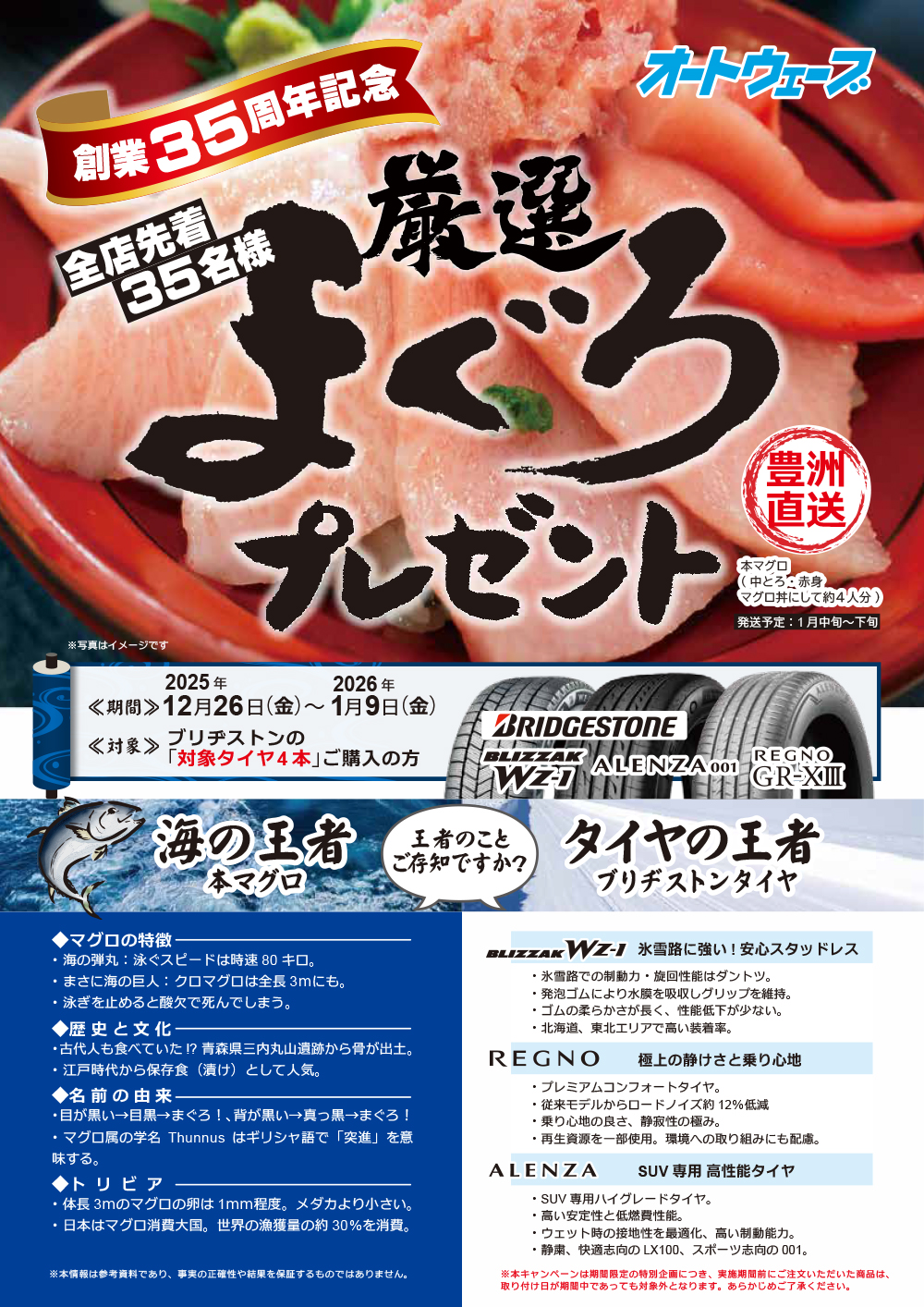 全店先着35名様に厳選まぐろプレゼント! タイヤ購入キャンペーン開催!