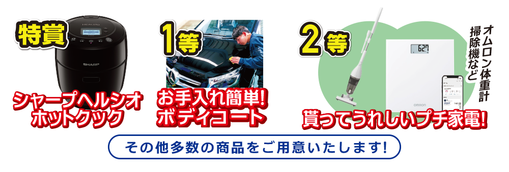 【はずれなし!】人気の電気調理鍋や、普段のお手入れが簡単になるボディコートなど、たくさんの景品をご用意しました!
