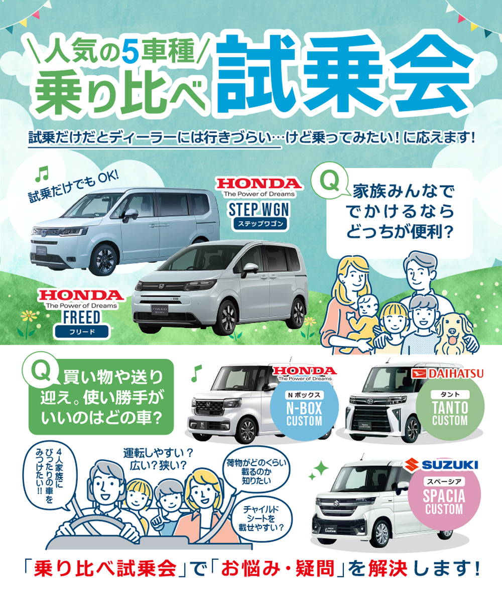 人気の5車種《ミニバン・軽自動車》乗り比べ試乗会開催!