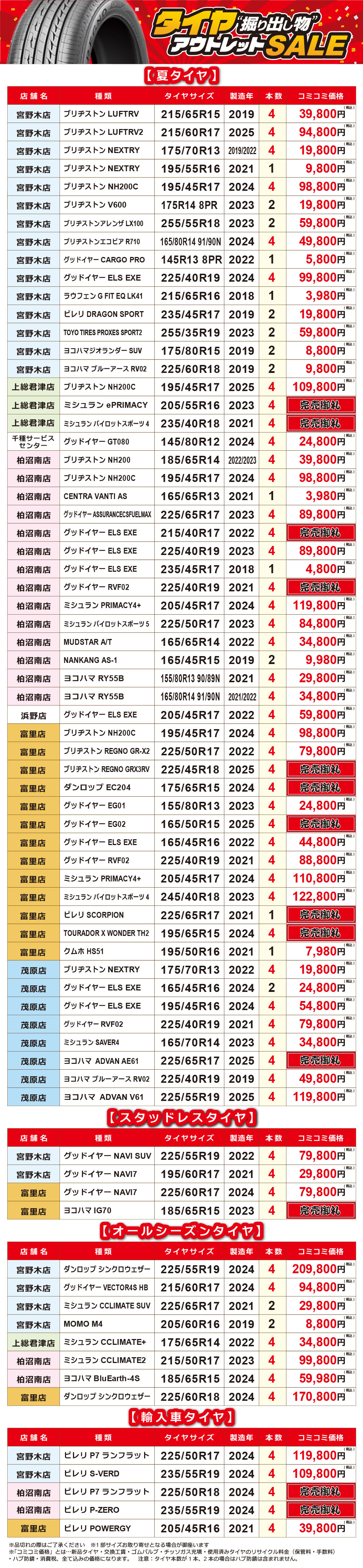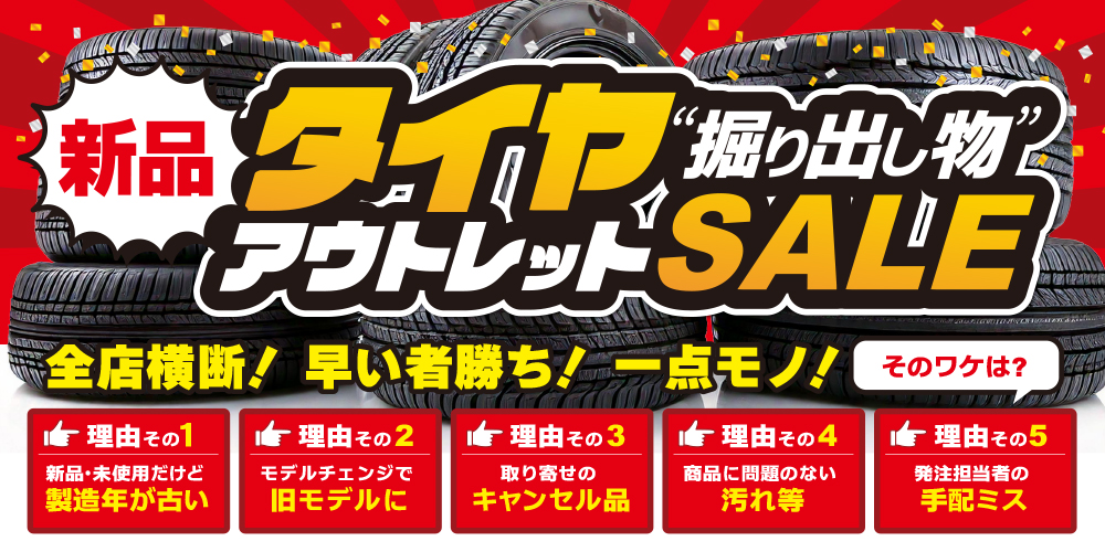 各商品1点限り! 新品タイヤ”掘り出し物”アウトレットセール開催!