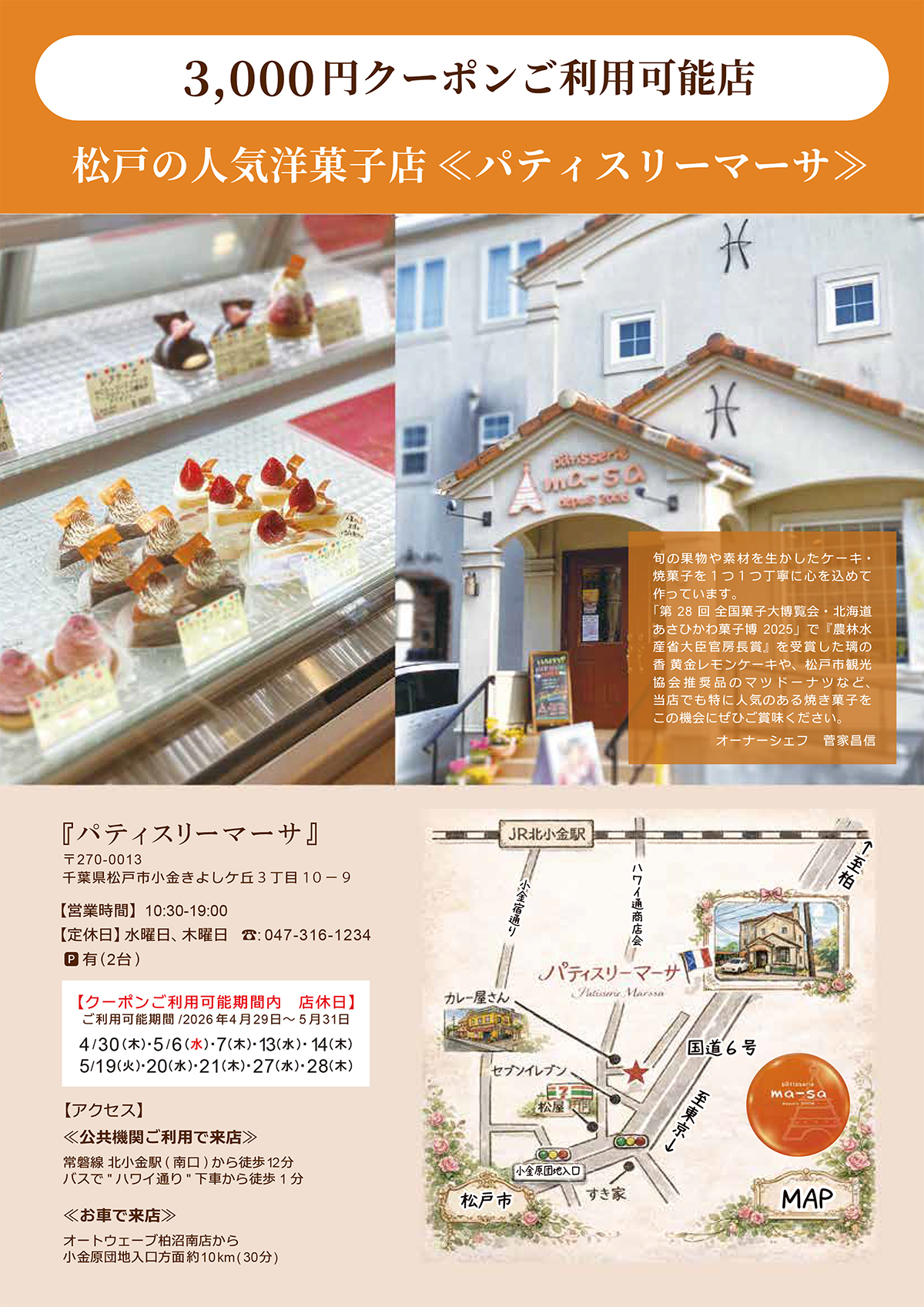 ※ケーキクーポンは2026年4/29から5/31までの間に限り、パティスリーマーサにてご利用いただけます。