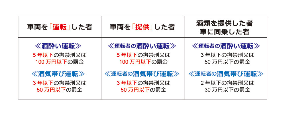 忘年会など12月は飲酒の機会も増える時期です。酒酔い運転の罰則は、5年以下の拘禁刑又は100万円以下の罰金ですが、その運転者に車両を提供した人の罰則は?