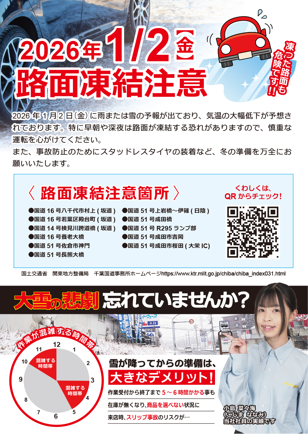 2026年1月2日(金) 千葉県内各所に降雪予報が出ています。スタッドレスタイヤの準備をお忘れなく!