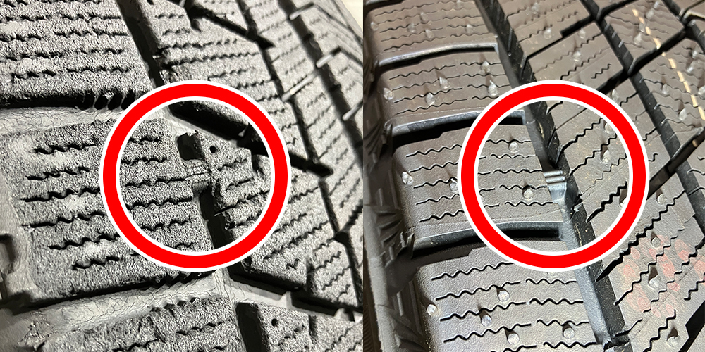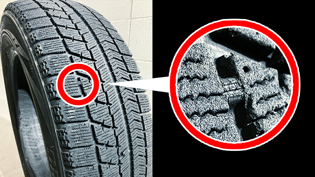 雪道を安全に走行するための「スタッドレスタイヤ」ですが、この写真のスタッドレスタイヤで雪道は安全に走行できるでしょうか?