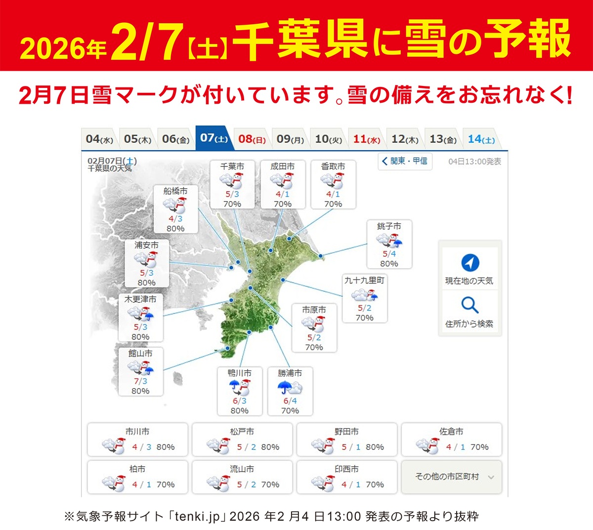2026年2月7日(土)・8日(日) 千葉県内各所に降雪予報が出ています