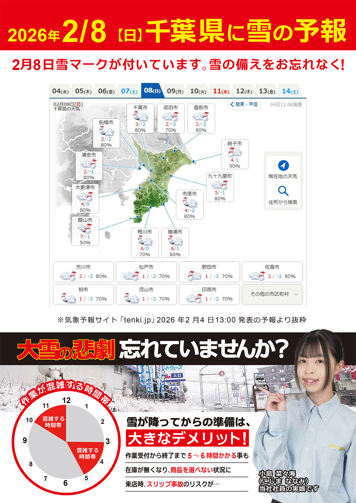 2026年2月7日(土)・8日(日) 千葉県内各所に降雪予報が出ています。スタッドレスタイヤの準備をお忘れなく!