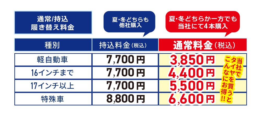 ※夏タイヤまたはスタッドレスタイヤのいずれか一方でも、当社にて4本ご購入いただいた場合は「通常料金」が適用されます。